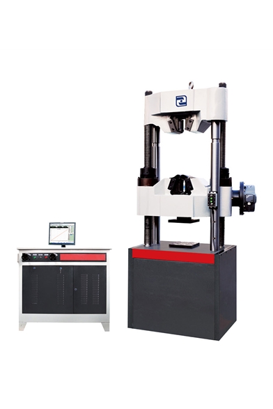 主機(jī)采用油缸下置式主機(jī),間隙密封油缸、兩立柱、兩絲杠框架結(jié)構(gòu)(俗稱四立柱)。上試驗(yàn)空間用于拉伸試驗(yàn),下試驗(yàn)空間可用于試樣的壓縮、彎曲和剪切試驗(yàn)(需增加相應(yīng)輔具)。下橫梁升降采用盤(pán)型電機(jī)帶動(dòng)蝸輪蝸桿、絲杠副傳動(dòng),實(shí)現(xiàn)拉伸、壓縮空間的調(diào)整。主油缸采用珩磨油缸,油壓傳感器測(cè)力(精密級(jí)需加負(fù)荷傳感器測(cè)力,屬于特殊配置)。自動(dòng)液壓夾緊系統(tǒng),裝夾試樣方便,穩(wěn)定性好。配置相關(guān)附具可完成鋼筋,金屬試樣、鋼鉸線(主機(jī)需要改動(dòng)),電纜,緊固件,混凝土等樣品的試驗(yàn)。