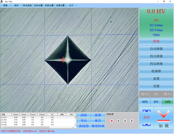 四點測量:鼠標(biāo)點取壓痕的四個頂點,讀出硬度值,同時有放大圖片實時顯示;